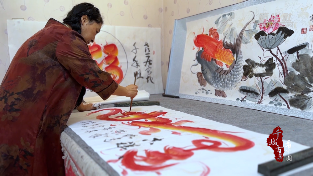 凝神斂氣,筆墨揮灑之間,由七條魚構(gòu)成的“如意”二字躍然紙上。在河北省廊坊市廣陽區(qū),非物質(zhì)文化遺產(chǎn)“魚書”代表性項目傳承人高文清,以魚之神態(tài)為字賦形,以畫組字、藏字于畫。她的這種將書畫融合的創(chuàng)作形式被稱為“魚書”。