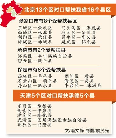 河北新聞網(wǎng)訊(河北日?qǐng)?bào)記者潘文靜)從省發(fā)改委獲悉,為推動(dòng)落實(shí)京津冀協(xié)同發(fā)展重大國(guó)家戰(zhàn)略,按照《關(guān)于進(jìn)一步加強(qiáng)東西部扶貧協(xié)作工作的指導(dǎo)意見》《京津兩市對(duì)口幫扶河北省張承環(huán)京津相關(guān)地區(qū)工作方案》要求,2016年至2020年,北京市、天津市對(duì)我省張家口市、承德市、保定市相關(guān)縣區(qū)開展對(duì)口幫扶。其中,北京市13個(gè)區(qū)對(duì)口幫扶張承保三市16個(gè)縣區(qū),天津市5個(gè)區(qū)對(duì)口幫扶承德市5個(gè)縣。