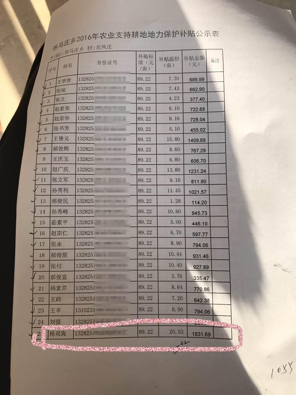 12月7日,趙廣慶到鄉(xiāng)政府開會后將補貼公示帶回村,并按照鄉(xiāng)里要求將公示表張貼在公開欄內(nèi)。補貼公示顯示,村支書楊雙海家的補貼面積有20.53畝,比村民王某多出4.73畝,比村民郝某多出19.25畝,遠遠高于全村平均水平。