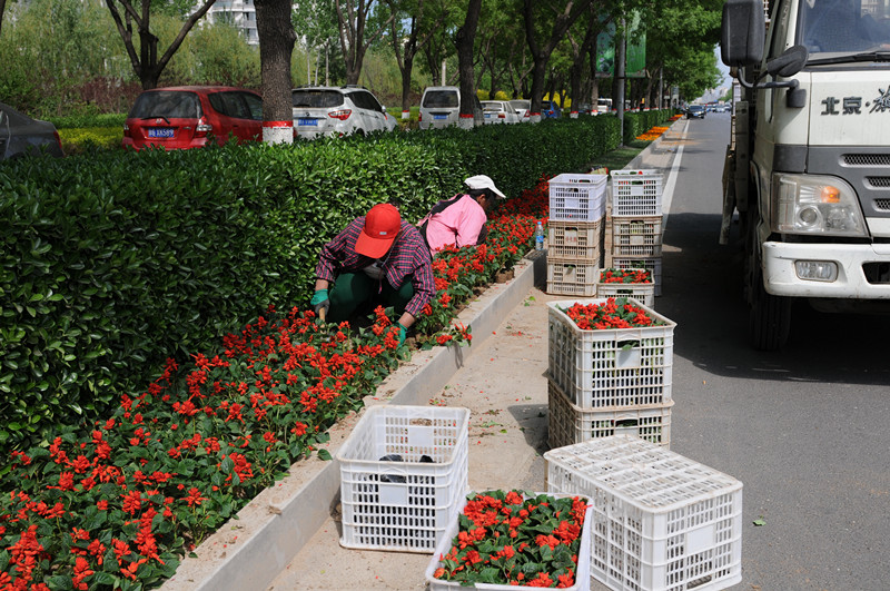 除了精心設(shè)計節(jié)點景觀外,市園林局還利用擺花提升美觀效果。在包括廊涿引線、西外環(huán)、西昌路、北鳳道、廣陽道、祥云道的6條道路,擺放立體花缽。沿迎賓線設(shè)置11個節(jié)點,擺放11組大型綠雕為主景,配以花境。對廣陽橋、永興橋、銀河大橋、新開橋、和平橋、愛民橋、民心橋、龍河中橋、龍河西橋、大皮營橋十座橋進行橋體美化,安裝波浪形、拱橋形、半圓造型、鞍式花盆等各種樣式的立體花盆。在和平路、廣陽道、金光道、愛民道等15條主次干道種植薔薇、藤本月季、地錦,打造立體綠化工程。