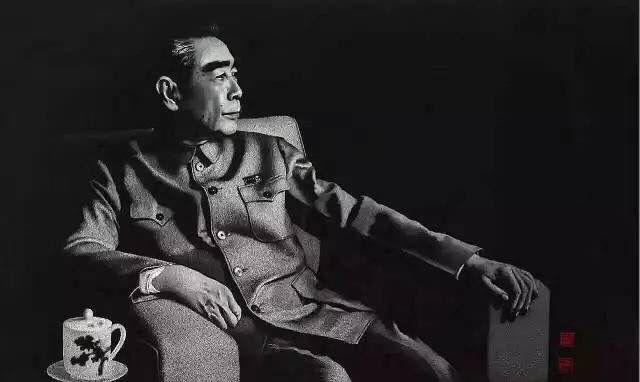 作品中的周總理在深深的背景中,面容消瘦,緊鎖著眉頭、額頭上繃起了青筋、面頰爬上了老人斑,雙目深邃而堅毅地注視著前方。每個看到這幅作品的人都會凝視良久,這就是活在每個中國人心中,為國家、為人民鞠躬盡瘁的周總理!