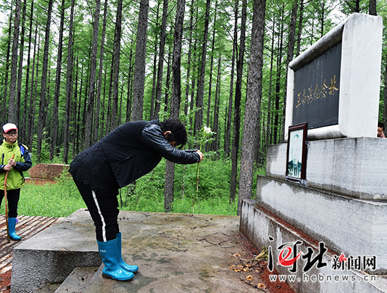 一位長春的游客聽完導(dǎo)游講述王尚海的故事后,在王尚海紀(jì)念林碑前鞠躬獻(xiàn)花,表達(dá)崇敬之情。 記者賈恒 霍艷恩攝