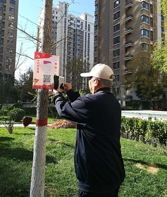 今年68歲的曹?chē)?guó)友是一名有著40多年黨齡的老黨員,也是一名緊跟科技時(shí)代的老人,看到社區(qū)樹(shù)干上所掛的十九大專(zhuān)題讀書(shū)牌,曹?chē)?guó)友隨手拿出手機(jī),熟練的掃碼,進(jìn)行閱讀。