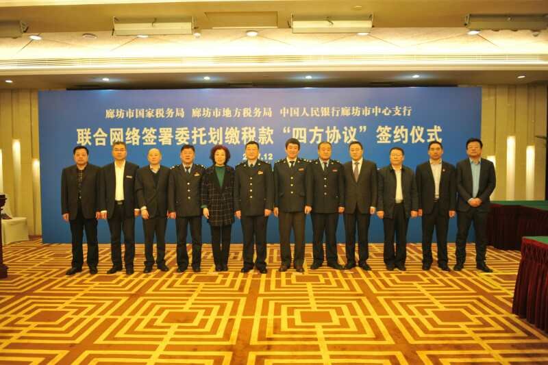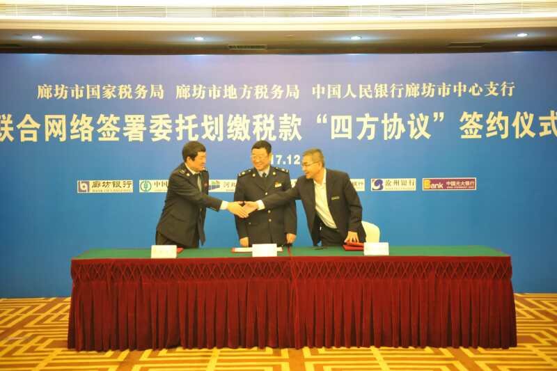 12月28日,市國(guó)稅局、市地稅局、中國(guó)人民銀行廊坊市中心支行舉行聯(lián)合網(wǎng)絡(luò)簽署委托劃繳稅款“四方協(xié)議”簽約儀式。現(xiàn)場(chǎng)與廊坊銀行、中國(guó)農(nóng)業(yè)銀行廊坊分行等七家商業(yè)銀行進(jìn)行簽約。