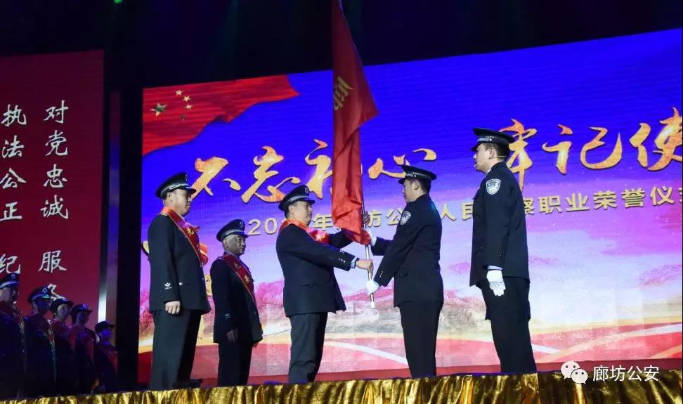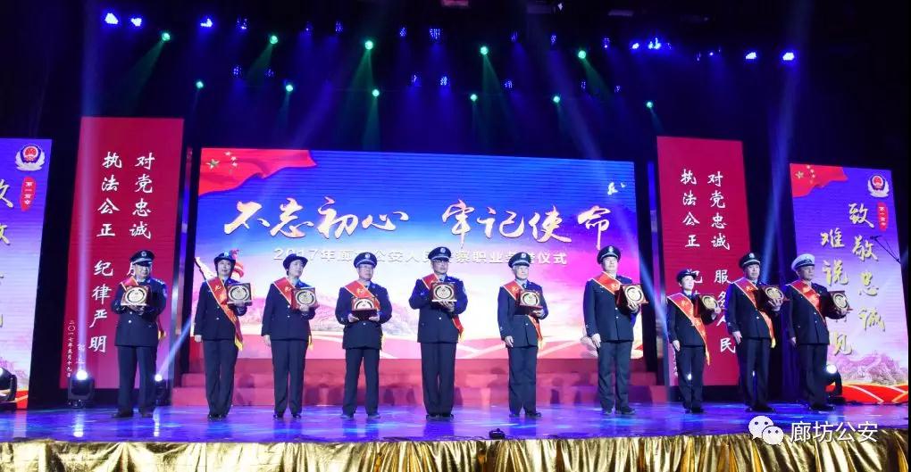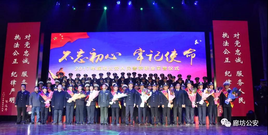 為進一步增加民警的成就感、榮譽感、責(zé)任感、歸屬感,貫徹習(xí)近平總書記提出的“對黨忠誠、服務(wù)人民、執(zhí)法公正、紀律嚴明”的總要求,12月28日晚,廊坊市公安局 “不忘初心 牢記使命” 2017年度人民警察職業(yè)榮譽儀式隆重舉行。