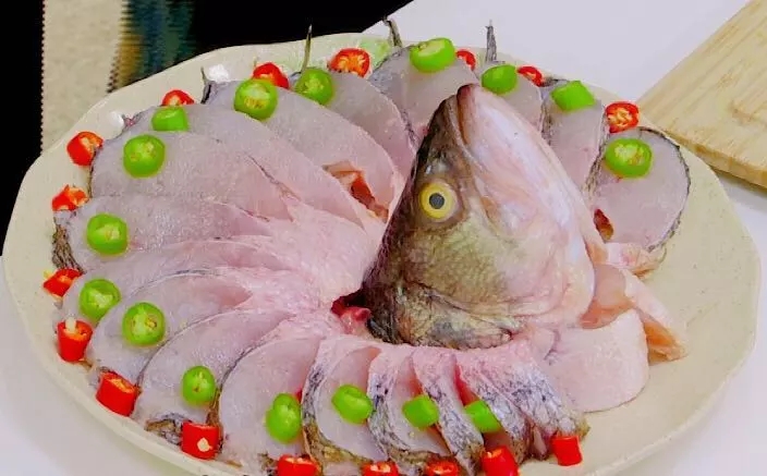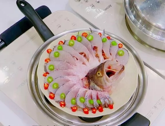 1、將魚身環(huán)切,擺成一個(gè)環(huán)形,撒上鹽、料酒,放上青紅辣椒