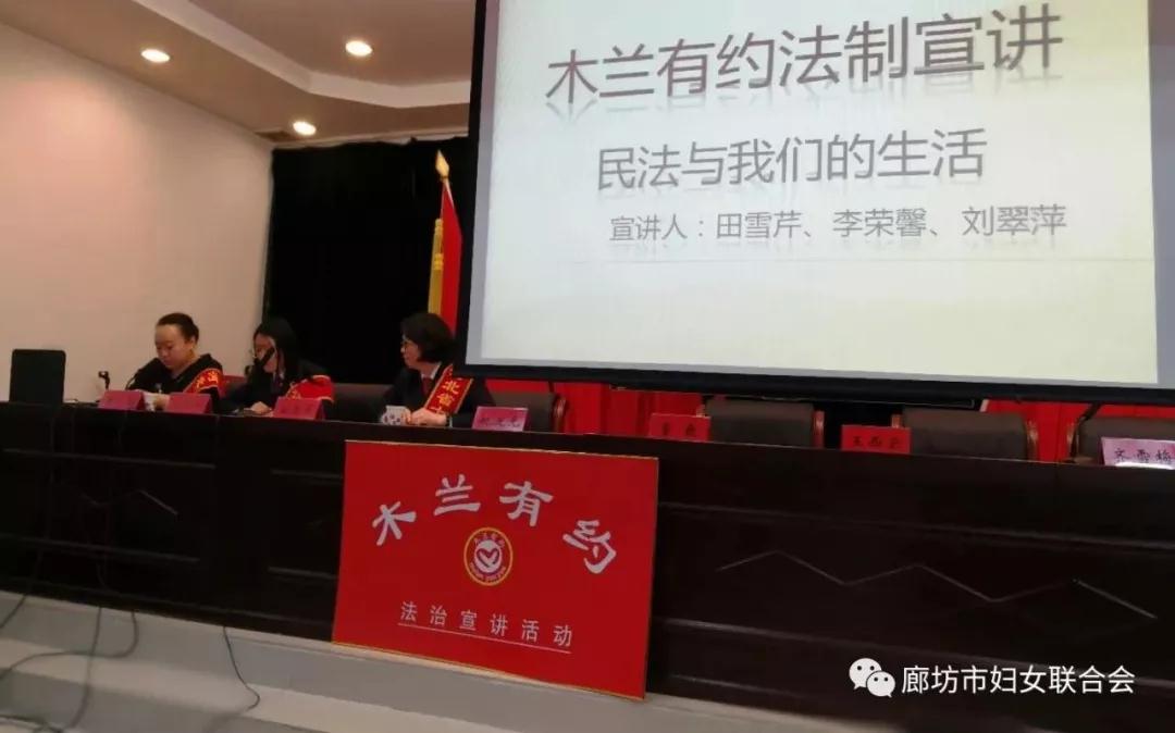 3月1日,廊坊市“木蘭有約”法治宣講團來到廊坊市廣陽區(qū)委和中國人民銀行廊坊市中心支行,進行了“民法與我們的生活”的法治宣講。宣講團成員由廊坊市中級法院女法官田雪芹,廣陽區(qū)檢察院女檢察官劉翠萍、趙明,河北陳玉芹律師事務(wù)所女律師李榮馨組成。廣陽區(qū)六十多個鄉(xiāng)鎮(zhèn)部門代表及工作人員共90多人,中國人民銀行廊坊市中心支行組織中心支行和8個縣(市、區(qū))支行的視頻會議,全系統(tǒng)共300人參加了宣講活動。