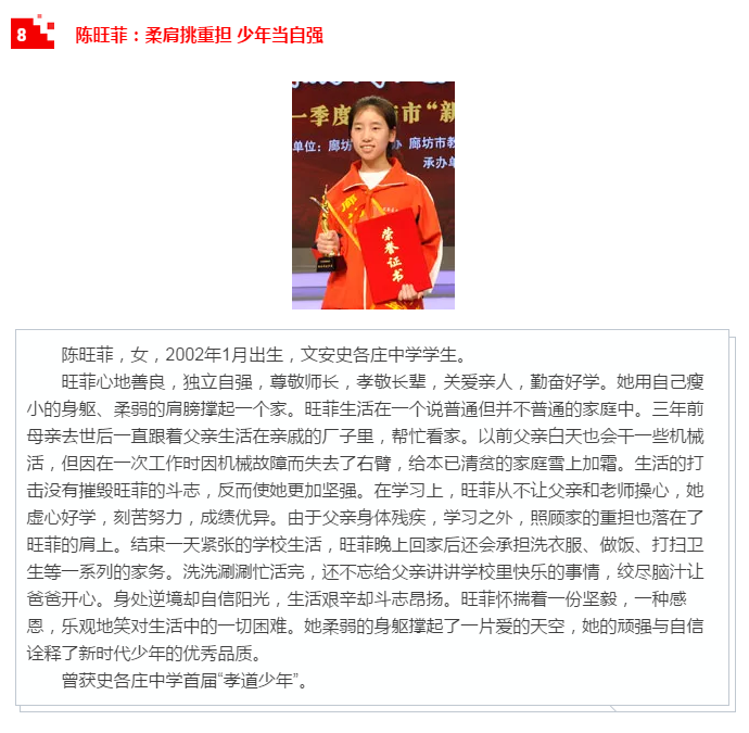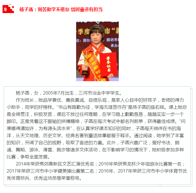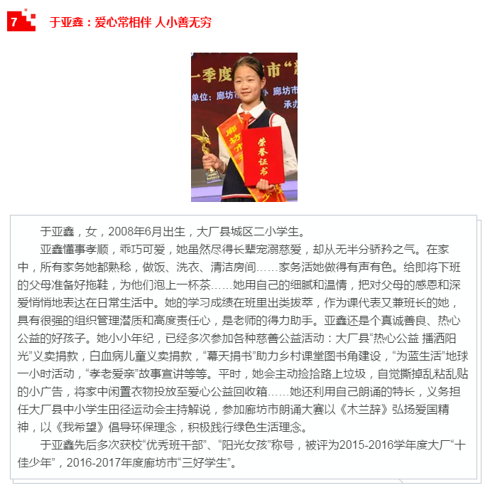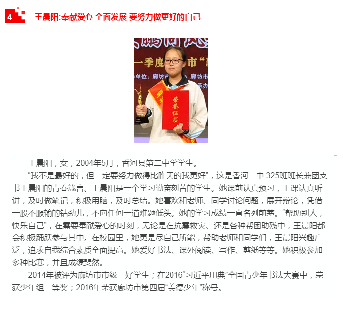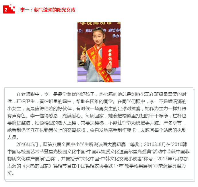 廊坊市“新時代好少年”學習宣傳活動是“扣好人生第一粒扣子”主題教育實踐活動的重要組成部分,通過培養(yǎng)樹立新時代好少年先進典型,發(fā)揮示范引領作用,號召廣大未成年人以“新時代好少年”為榜樣,形成“人人踐行核心價值觀、爭當時代新人”的生動局面,引導他們見賢思齊、向上向善、孝老愛親、忠于祖國、忠于人民,從小立志向、有夢想,愛學習、愛勞動、愛祖國,努力成長為擔當民族復興大任的時代新人。