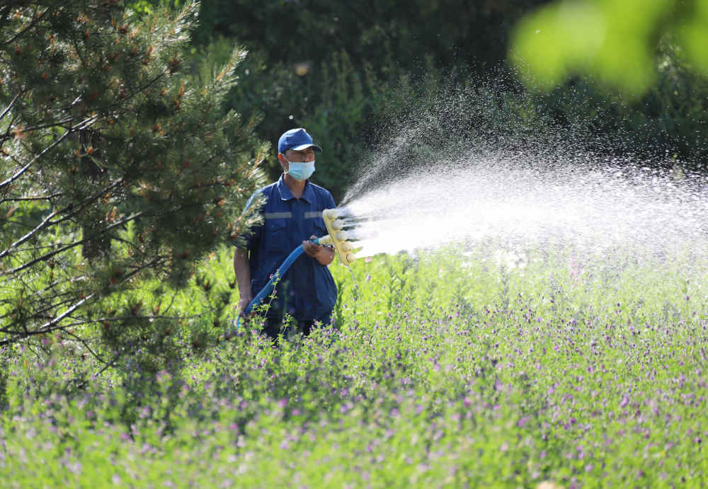 6月2日,在固安縣濱河生態(tài)運(yùn)動(dòng)公園,園林工人進(jìn)行噴淋作業(yè)。(門叢碩 攝)