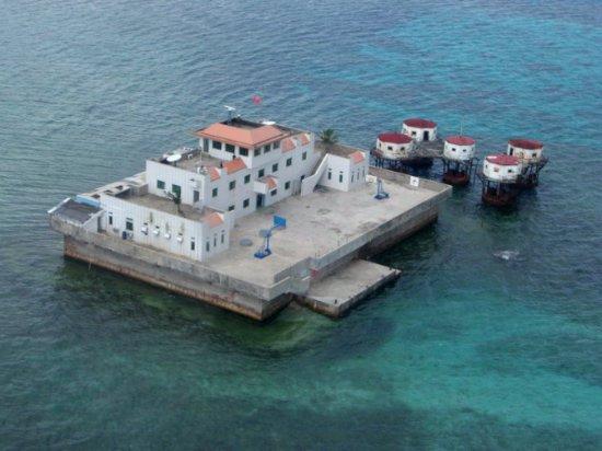 資料圖:位于南沙美濟(jì)礁上的中國哨所。業(yè)內(nèi)人士透露中國正籌建養(yǎng)魚工船,集養(yǎng)魚、加工、倉儲、海上服務(wù)于一體,可對漁船進(jìn)行補(bǔ)給、收魚等作業(yè),猶如遠(yuǎn)海生產(chǎn)基地。