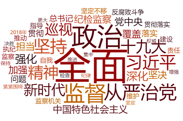 公報全文2831字,其中被提及數(shù)前十的關(guān)鍵詞分別是“全面(25次)”“政治(17)”“監(jiān)督(13次)”“堅持(13次)”“從嚴治黨(12次)”“精神(12次)”“習近平(11次)”“十九大(10次)”“新時代(9次)”“巡視(9次)”。