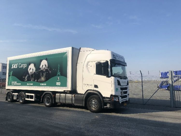 4月4日,在丹麥?zhǔn)锥几绫竟膭P斯楚普國(guó)際機(jī)場(chǎng),一輛印有歡迎“星二”和“毛筍”(“毛二”的乳名)來(lái)哥本哈根字樣的集裝箱卡車(chē)等待運(yùn)送大熊貓。(新華社發(fā) 何李杰攝)