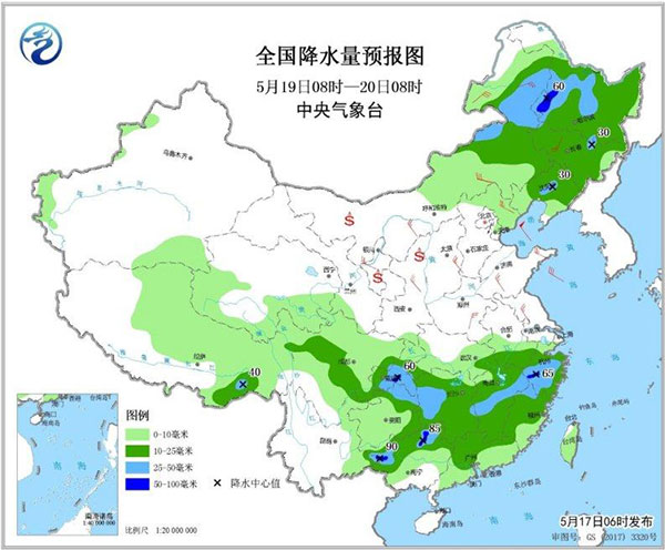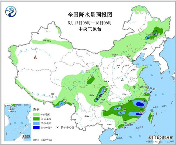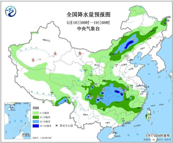 圖1 全國降水量預報圖(5月17日08時-18日08時)