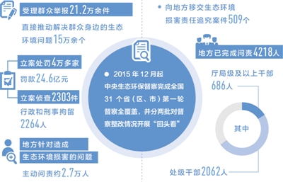 受理群眾舉報(bào)21.2萬余件,直接推動(dòng)解決群眾身邊的生態(tài)環(huán)境問題15萬余個(gè);立案處罰4萬多家,罰款24.6億元;立案?jìng)刹?303件,行政和刑事拘留2264人;地方針對(duì)造成生態(tài)環(huán)境損害的問題,主動(dòng)問責(zé)約2.7萬人。這是第一輪督察及“回頭看”的有關(guān)數(shù)據(jù),生態(tài)環(huán)保“欽差”業(yè)績(jī)不一般,共向地方移交生態(tài)環(huán)境損害責(zé)任追究案件509個(gè),地方已完成問責(zé)4218人,其中廳局級(jí)及以上干部686人、處級(jí)干部2062人。