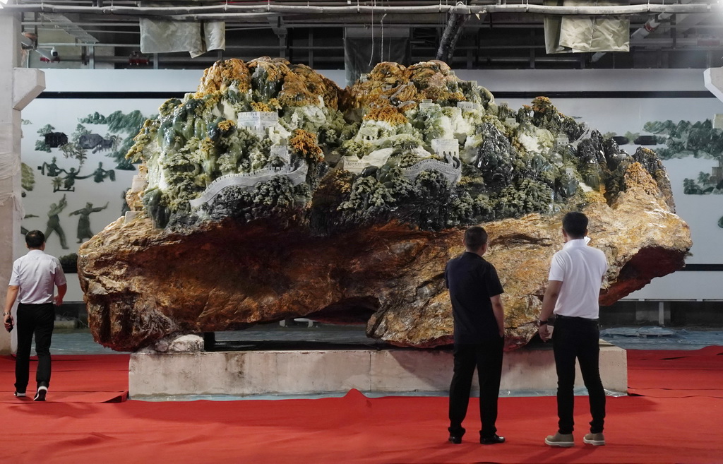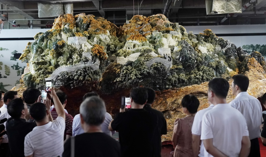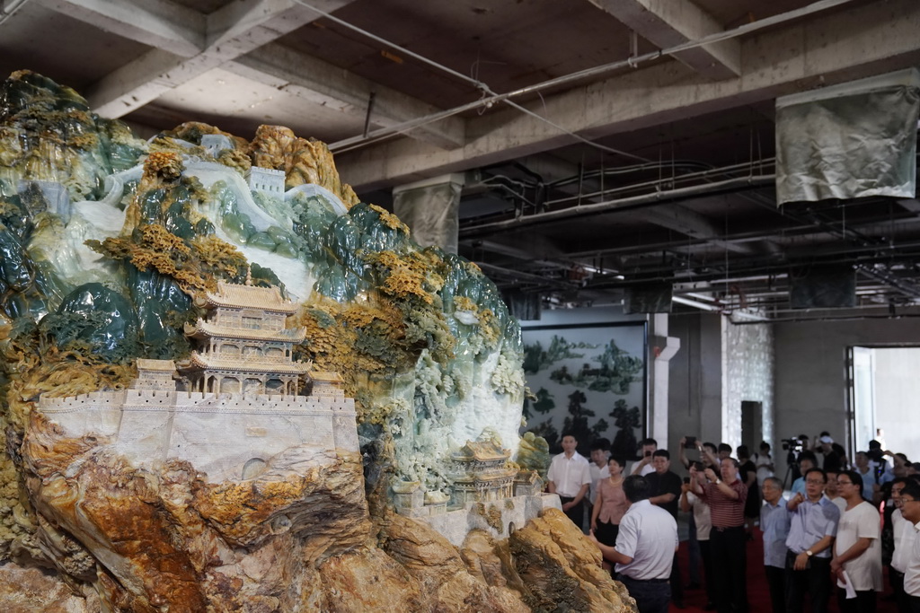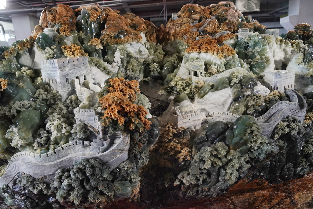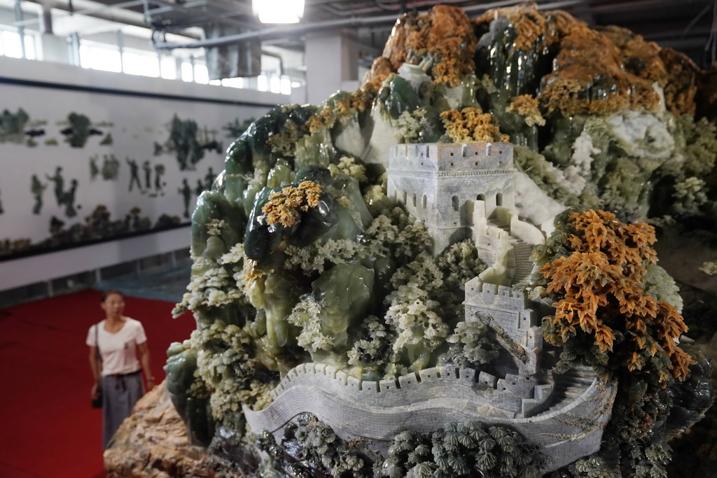 8月16日,巨型長城主題玉雕在遼寧岫巖滿族自治縣亮相。該玉雕長近6.5米、高逾3米、厚近4米,由30余位玉雕技師歷時14個月,在一塊單體重達118噸的岫巖玉石上進行設計與雕琢而成。巨型玉雕以明長城為藍本,采用立體雕、鏤空雕、深浮雕、淺浮雕、透雕等多種雕刻技法,在玉料紅、黃、藍、綠、白、黑等顏色襯托下,突出展現(xiàn)長城的氣勢磅礴。新華社記者 金良快 攝