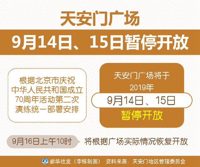 記者從天安門地區(qū)管理委員會獲悉,根據(jù)北京市慶祝中華人民共和國成立70周年活動第二次演練統(tǒng)一部署安排,天安門廣場將于2019年9月14日、15日暫停開放。9月16日上午10時,將根據(jù)廣場實際情況恢復開放。