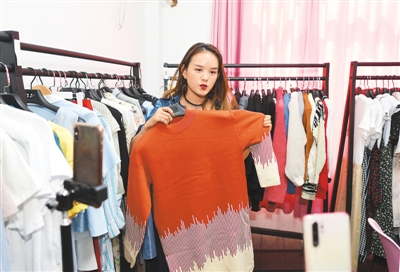 據(jù)不完全統(tǒng)計(jì),目前浙江義烏有“網(wǎng)紅直播”從業(yè)者6000多人,涉及市場(chǎng)經(jīng)營(yíng)戶(hù)3000余家。圖為在義烏市北下朱村的一家服裝店內(nèi),網(wǎng)紅主播正在直播。 |