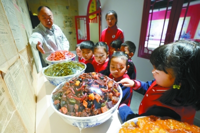 推開兩扇紅色大門,步入果脯博物館展廳。展陳由果脯溯源、北京果脯發(fā)展史、北京果脯傳統(tǒng)制作技藝、果脯工藝與器具沿革、果脯文化和紅螺食品企業(yè)史等五部分組成,展覽形式包括文字介紹、圖片、雕塑、實物、檔案資料、場景還原等。展廳里,有一面灰墻拱券門窗、紅色門板窗框的門面房,門頭上寫著“聚順和棧 南貨老店”,再現了北京果脯老店聚順和當年的模樣。博物館仿建了門臉兒進行展示,走進屋里,桌上一溜兒青花瓷大盆里盛著冒尖的果脯一如當年模樣。選料、原料初加工、清洗護色、發(fā)酵、制作飴糖、糖制、晾曬、整形包裝……文字說明配以人物雕像和各種實物工具,展覽情景再現了北京果脯傳統(tǒng)制作工藝的八大步驟。展廳里還展示了歷代盛放果脯的食盒以及各色果脯包裝紙。