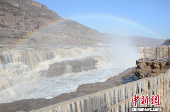 資料圖:小雪時節(jié),黃河壺口瀑布出現(xiàn)冰掛,天空中伴有一道彩虹?!埥?攝