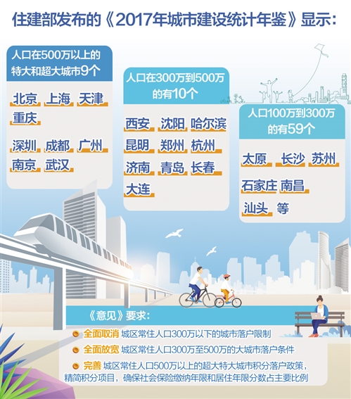 武漢大學(xué)中國發(fā)展戰(zhàn)略與規(guī)劃研究院副院長吳傳清認(rèn)為,這與今年4月國家發(fā)展改革委發(fā)布的《2019年新型城鎮(zhèn)化建設(shè)重點任務(wù)》相互呼應(yīng),并更加深化?!吨攸c任務(wù)》提出,繼續(xù)加大戶籍制度改革力度,在此前城區(qū)常住人口100萬以下的中小城市和小城鎮(zhèn)已陸續(xù)取消落戶限制的基礎(chǔ)上,城區(qū)常住人口100萬至300萬的Ⅱ型大城市要全面取消落戶限制;城區(qū)常住人口300萬至500萬的Ⅰ型大城市要全面放開放寬落戶條件,并全面取消重點群體落戶限制。超大特大城市要調(diào)整完善積分落戶政策,大幅增加落戶規(guī)模、精簡積分項目,確保社保繳納年限和居住年限分?jǐn)?shù)占主要比例。