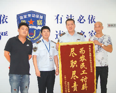 2019年8月,北京市朝陽區(qū)勞動保障監(jiān)察隊監(jiān)察員為10余農(nóng)民工成功討薪,農(nóng)民工代表送錦旗以示感謝。受訪者供圖