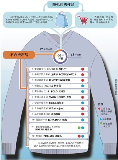 北京市消費(fèi)者協(xié)會工作人員,以普通消費(fèi)者的身份,在北京市的王府中環(huán)、北京SKP、燕莎友誼商城、北京老佛爺百貨、西單大悅城、上品折扣草橋店等商場,以及天貓商城、京東商城、唯品會和蘇寧易購等4個網(wǎng)絡(luò)購物平臺隨機(jī)購買了60件羊絨衫,價格從380元至8588元不等,對樣品的產(chǎn)品使用說明、纖維含量、起毛起球等指標(biāo)進(jìn)行比較試驗(yàn),其中17件存在不同問題。