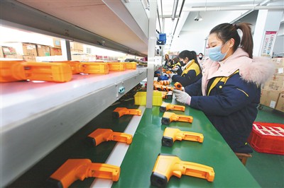 作為一家生產(chǎn)儀器儀表和紅外測(cè)溫設(shè)備的企業(yè),安徽馬鞍山川宇電子有限公司提前結(jié)束休假,復(fù)工復(fù)產(chǎn)。目前,該公司紅外測(cè)溫槍生產(chǎn)線已開足馬力,日產(chǎn)量達(dá)1000臺(tái)左右。圖為1月31日,川宇電子的紅外測(cè)溫設(shè)備生產(chǎn)線上,工人們正在緊張作業(yè)。 |