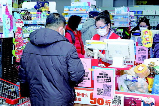 春節(jié)以來,超市客流量增加,物美超市北京石景山區(qū)太陽島門店收銀員葉宗萍一直在門店堅守,從春節(jié)至今沒歇一天。采訪對象供圖