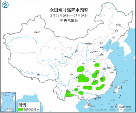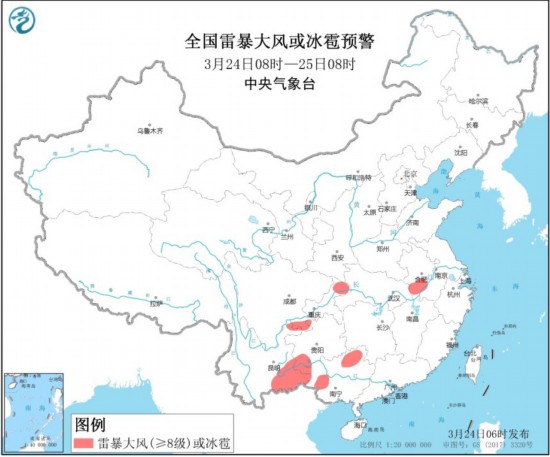 預計3月24日08時至25日08時,云南東南部、四川東南部、廣西北部和西南部、重慶北部、安徽西南部等地的部分地區(qū)有8-10級雷暴大風或冰雹天氣。云南東南部、四川東北部、重慶、貴州東北部和南部、河南南部、湖北東部、湖南、江西、廣西中北部、廣東北部等地的部分地區(qū)有短時強降水天氣,預計小時雨量20-40毫米,局地可達50毫米。強對流的主要發(fā)生時段為今天夜間。