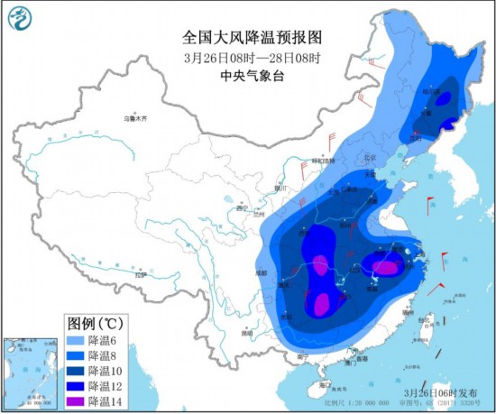 26日08時至28日08時,西北地區(qū)東部、華北、東北地區(qū)大部、黃淮、江淮、江漢、江南大部等地先后有4~6級風(fēng),陣風(fēng)7~9級,上述大部地區(qū)日平均氣溫或最低氣溫下降6~10℃,黑龍江南部、吉林北部和東南部、陜西東南部、河南西南部、湖北西部、湖南西部、安徽南部等地的部分地區(qū)降溫可達12℃以上。