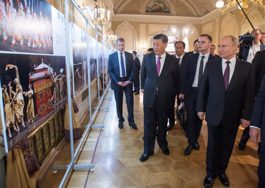 ↑6月5日,習主席和普京總統(tǒng)在莫斯科大劇院共同出席中俄建交70周年紀念活動?;顒忧?,兩國元首共同參觀中俄建交70周年圖片展。新華社記者李學仁攝