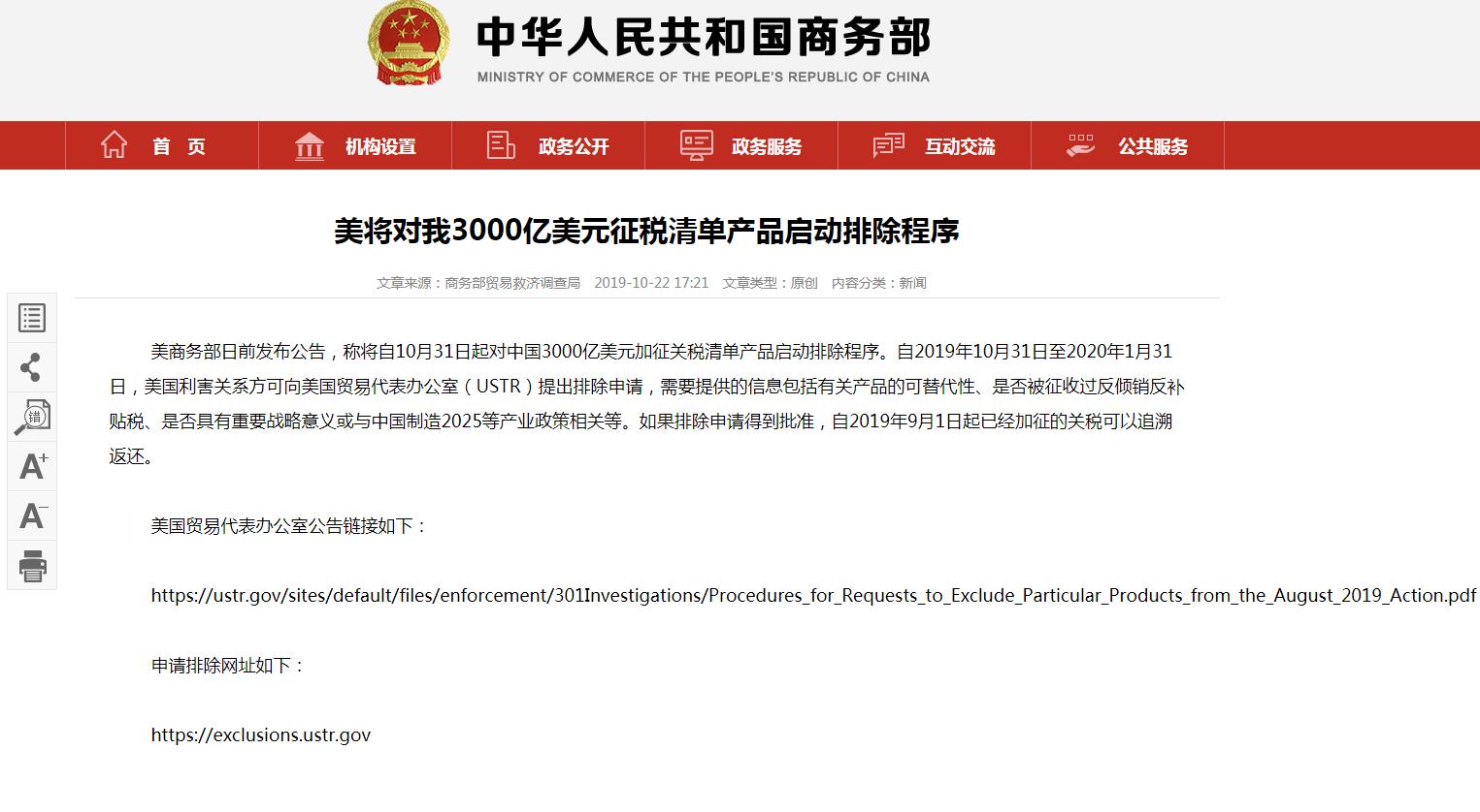 據(jù)商務(wù)部網(wǎng)站消息,美商務(wù)部日前發(fā)布公告,稱將自10月31日起對(duì)中國(guó)3000億美元加征關(guān)稅清單產(chǎn)品啟動(dòng)排除程序。自2019年10月31日至2020年1月31日,美國(guó)利害關(guān)系方可向美國(guó)貿(mào)易代表辦公室(USTR)提出排除申請(qǐng),需要提供的信息包括有關(guān)產(chǎn)品的可替代性、是否被征收過反傾銷反補(bǔ)貼稅、是否具有重要戰(zhàn)略意義或與中國(guó)制造2025等產(chǎn)業(yè)政策相關(guān)等。如果排除申請(qǐng)得到批準(zhǔn),自2019年9月1日起已經(jīng)加征的關(guān)稅可以追溯返還。