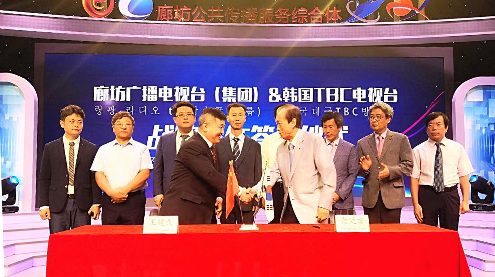圖為廊坊廣播電視臺黨委書記、臺長王建久(左)、韓國TBC電視臺社長金廷吉分別代表雙方簽約,雙方達(dá)成戰(zhàn)略合作。